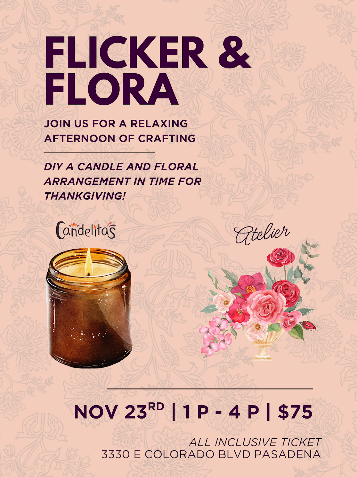 Join Candelitas and Atelier for Flicker & Flora, a special candle making workshop and floral arrangement class in Pasadena, CA, on Saturday, November 23, 2025. Created in collaboration with Atelier by Artmingo, this event is a perfect opportunity for creatives to connect, create, and unwind. Reserve your seat for an inspiring afternoon of creativity and community.